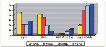 ͼ1 Ëùʾ´Ó1999Äêµ½2002Ä꣨2002ÄêµÄÊý¾ÝÊÇÓÉÉϰëÄêÊý¾ÝÍÆËã¶øÀ´£©µ¥Ì½Í·¡¢Ë«Ì½Í·¡¢Ë«Ì½Í·´ø¶¨Î»ÏµÍ³ºÍ¶à̽ͷ·ûºÏÏß·£¬ËÄÖÖ²»Í¬ºËҽѧÉ豸ÿÄê¸÷ÖÖÀàÐÍËùÕ¼±ÈÀý¡£¿ÉÒÔ¿´³ö¡£×îΪÃ÷ÏÔµÄÊÇÆÕͨ˫̽ͷÔÚ2002Äê½ö½öÕ¼×ÜÊýµÄ5%£¬ÆÕͨµ¥Ì½Í·Õ¼×ÜÊý25%£¬¶à̽ͷ´ø·ûºÏµç·ϵͳռ×ÜÊý59%¡£ÆÕͨ˫̽ͷ´øXÏß¶¨Î»ÏµÍ³Õ¼×ÜÊý10%¡£¿ÉÒÔ¿´³öµ¥Ì½Í·SPECTºÍ¶à̽ͷ·ûºÏµç·ϵͳ³ÊÔö³¤Ç÷ÊÆ£¬ÓÈÆäÒÔ¶à̽ͷ·ûºÏµç·ϵͳ¸üΪÃ÷ÏÔ¡£