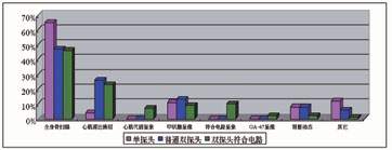 ͼ2 ´Ó2001Äê7ÔÂ-2002Äê6Ôµ÷ÑÐ10¼Òµ¥Ì½Í·Óû§¡¢5¼ÒÆÕͨ˫̽ͷÓû§ºÍ30¼Ò˫̽ͷ¿É±ä½Ç¶È´øÓзûºÏµç·Óû§ÁÙ´²¼ì²éÀàÐ͵ÄÊý¾Ý¡£ÎªÁ˱ãÓڱȽÏ£¬²ÉÓÃÏà¶ÔÊýµÄ·½·¨¡£¿ÉÒÔ¿´³ö¶ÔÓÚµ¥Ì½Í·Óû§ÔÚÁÙ´²Ö÷ÒªÓÃÓÚ¹ÇɨÃèºÍ¼××´ÏÙ¼ì²é¡£¶ÔÓÚ˫̽ͷ´øÓзûºÏµç·ϵͳµÄÓû§£¬¹ÇɨÃè46%¡¢Ðļ¡ÑªÁ÷¹à×¢23%¡¢·ûºÏµç·10%¡¢¼××´ÏÙ9%¡¢Ðļ¡´úл7%¡¢GA-67Ϊ2%£¬ÆäËü£¨ÉöÔà¡¢¸ÎµÈ£©3%¡£¿ÉÒÔ¿´³ö˫̽ͷ·ûºÏµç·ϵͳ×î´óµÄ¹±Ï×ÊÇΪÁÙ´²¿ªÍسö20%еļì²éÏîÄ¿£¬×îÎªÖØÒªµÄÊÇÕâЩ¼ì²éÏîÄ¿½«³ÉΪÖ÷Á÷ÁÙ´²¼ì²é¡£Õâ¿ÉÄÜÊÇ˫̽ͷ£¨¶à̽ͷ£©·ûºÏµç·ÔÚ¹úÄÚ¼±¾çÔö¼ÓµÄÖ÷ÒªÔ­Òò¡£