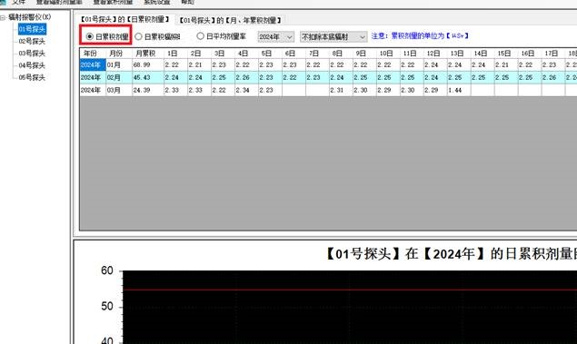 ±¾Èí¼þ×îºËÐĵŦÄÜÄ£¿éÓÐËĸö£º²é¿´¼ÁÁ¿ÂÊ¡¢²é¿´¼ÁÁ¿Âʱ¨¾¯Êý¾Ý¡¢²é¿´ÈÕÀÛ»ý¼ÁÁ¿ºÍ²é¿´×ÜÀÛ»ý¼ÁÁ¿¡£Èí¼þͨ¹ýÇúÏߺͰô״ͼµÄ·½Ê½½«Ì½Í·µÄ¼ÁÁ¿ÂʺÍÀÛ»ý¼ÁÁ¿Êý¾Ý½øÐÐÁ˳ä·Öչʾ¡£²é¿´¼ÁÁ¿ÂÊÄ£¿éÄÜ¿´10ÄêµÄÀúÊ·¼ÁÁ¿ÂÊÊý¾Ý£¬²¢½«Ã¿¸ö̽ͷһÌì86400Ìõ²âÁ¿Êý¾ÝÒ»´ÎÐÔ¼ÓÔØ³ÉÒ»Ìõ²âÁ¿ÇúÏߣ¬Í¬Ê±°´²»Í¬±¨¾¯Ä£Ê½¼ÓÔØ±¨¾¯ãÐÖµÏߣ¬Í¨¹ýÈËÑ۱ȶÔ£¬¾ÍºÜÈÝÒ×¹Û²ì³öÒÇÆ÷Ò»ÌìµÄ·øÉä²âÁ¿Êý¾Ý·Ö²¼×´¿ö¡£²é¿´·øÉ䱨¾¯Êý¾ÝÄ£¿é¿ÉÒÔ°´Ì½Í·ºÅ¡¢±¨¾¯ÀàÐͺͲâÁ¿Ê±¼äµÄ¹ØÏµ²éѯ³öʲôʱºòÄǸö̽ͷ·¢Éú¹ý·øÉ䳬ãÐÖµ±¨¾¯¡¢Ì½Í·µôÏß±¨¾¯¡¢»úÆ÷¹ÊÕϱ¨¾¯¡¢¼à²âÊý¾ÝÒç³ö±¨¾¯µÈ£¬Í¬Ê±Ò²Õ¹ÏÖ¸ÃÌì̽ͷµÄÈ«²¿²âÁ¿Êý¾Ý·Ö²¼¡£²é¿´ÈÕÀÛ»ý¼ÁÁ¿Ä£¿éÊǶÔ10ÄêÄÚÿÌìµÄÈÕÀÛ»ý¼ÁÁ¿½øÐзÖÎö£¬ÒÔÇúÏß»ò°ô״ͼµÄÐÎʽչʾ¸Ã̽ͷµÄÈÕÀÛ»ý¼ÁÁ¿¡¢ÔÂÀÛ»ý¼ÁÁ¿¡¢ÄêÀÛ»ý¼ÁÁ¿¡¢ÈÕÆ½¾ù¼ÁÁ¿ÂÊ¡¢ÔÂÆ½¾ù¼ÁÁ¿ÂÊ¡¢ÄêÆ½¾ù¼ÁÁ¿ÂÊ·Ö²¼¡£²é¿´×ÜÀÛ»ý¼ÁÁ¿Ä£¿éÓÃÀ´±£´æÌ½Í·ÉÏ´ÎÊý¾ÝÇåÁãºóÖÁ½ñËùÀÛ»ýµÄ×ÜÀÛ»ý¼ÁÁ¿ÒÔ¼°×ܵį½¾ù¼ÁÁ¿ÂÊÖµ¡£´ËÍâ±¾Èí¼þ»¹Ìṩ±¨¾¯Êý¾Ýͳ¼Æ·ÖÎö£¬Í¨¹ýÈý¸ö²»Í¬µÄͳ¼Æ±¨±íÀ´Îª·øÉäÒÇÆ÷Ëù·¢ÉúµÄ¸÷À౨¾¯·ÖÎöÌṩÊý¾ÝÖ§³Ö¡£